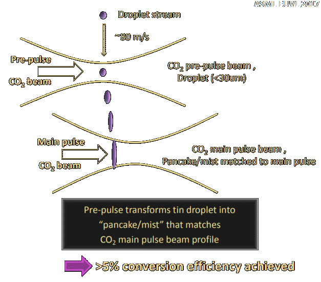 Now let’s talk source, and then in particular source power, and its closely related demon of necessary photoresist dose. So, what is our source for 13.5 nm light? We mentioned before that we use ArF excimer lasers for 193, so if you guessed a laser come up and collect your prize. For 13.5 nm we use a laser produced plasma (LPP) from tin droplets. Molten tin is filtered, and then dropped into a chamber. As it drops it is hit by a shaping pulse which flattens the droplet to match the shape of the main pulse. The main pulse (~30 KW) then hits the tin ‘pancake’ and forms a plasma that emits at best 6% of that power as 13.5 nm light, which is then dropped far further by mirror absorption as we talked about earlier. What happens to the rest of the tin droplet? Well it somewhat sputters all over the place, some of it is collected and some of it is removed via hydrogen cleaning. EUV tools have about 70%-80% uptime mainly due to how maintenance intensive the source is, and eventually it needs to be replaced due to tin build up.