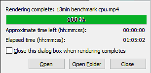 | MEGUI x264 CPU Encode | 29 | 3.27 GiB | 35.7 - 50.5 Mb/s |